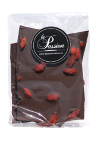 Ingrédients : Sucre, beurre de cacao, émulsifiant (lécithine de soja), extrait de vanille, amandes, pâte de cacao, cacao, baie de Goji (provenance : Chine)