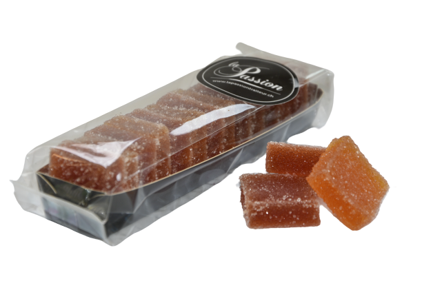 Ingrédients : Sucre, purée de fruits (varie en fonction de la saison : pomme, framboise, fraise, abricot, fruit de la passion, mûre, coco, kiwi, ananas, cassis, poire, mangue, coin), sirop de glucose, pectine, acide citrique